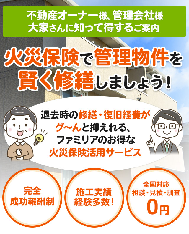 ファミリアの火災保険活用サービスは、不動産オーナー様、不動産管理会社様、大家の利益追求のためにあらゆる分野でサポートするサービスです。今まで使ってこなかった保険を申請することで、原状回復・リフォーム工事・大規模修繕工事を実績、経験豊富なプロ集団が申請から施工までワンストップで実施いたします。